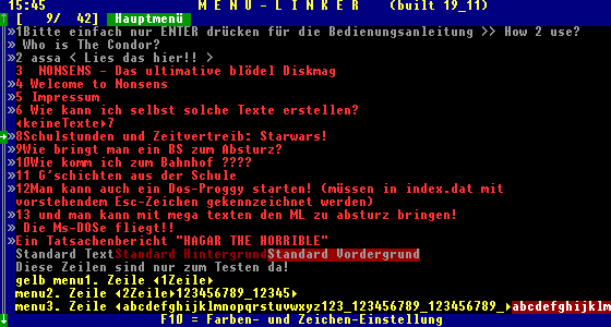 Textorientiertes Menu-System. Es war ursprünglich (1998) für ein DiskMag entworfen. Ich hab leider niemanden gefunden (keine gescheiten kontakte), der dafür schreiben wollte, interesse gabs auch keins :-( Danach wollt ichs als Hilfe-Menu (1999) für meine Programme weiterentwickeln - Ist auch nichts draus geworden. Dann anfang 2000 bekam ich endlich Feedback - von noniq. Er war/ist wertvollster Beta-Tester! Dann kam endlich das Konfig-Menu dazu, mit dem man den ML komfortabel einstellen kann.